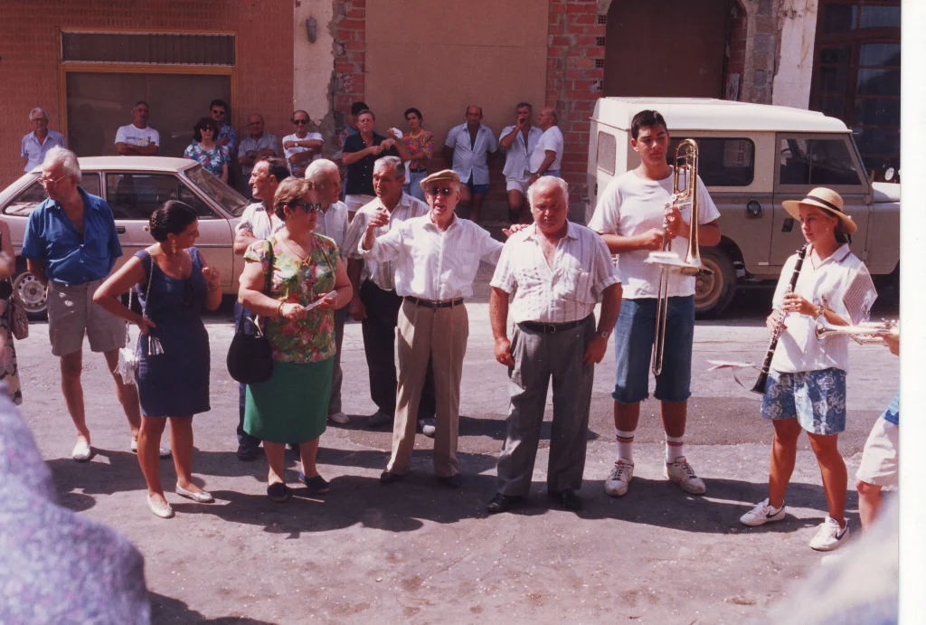Mari d’Aldaia junt als Xiquets de Mislata i la Romereta, 16 d’agost de 1990 a Bétera. Arxiu Caroli de Bétera.
